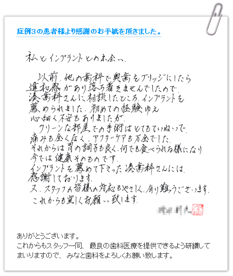 実はこの方(症例1)はインプラント装着後、庭で脚立に乗って手入れをしていらしたところ落下し、あごを強打されたのですが、インプラントは全く問題がなく、逆にご自分の歯であれば折れていたのではないかと思いました。
